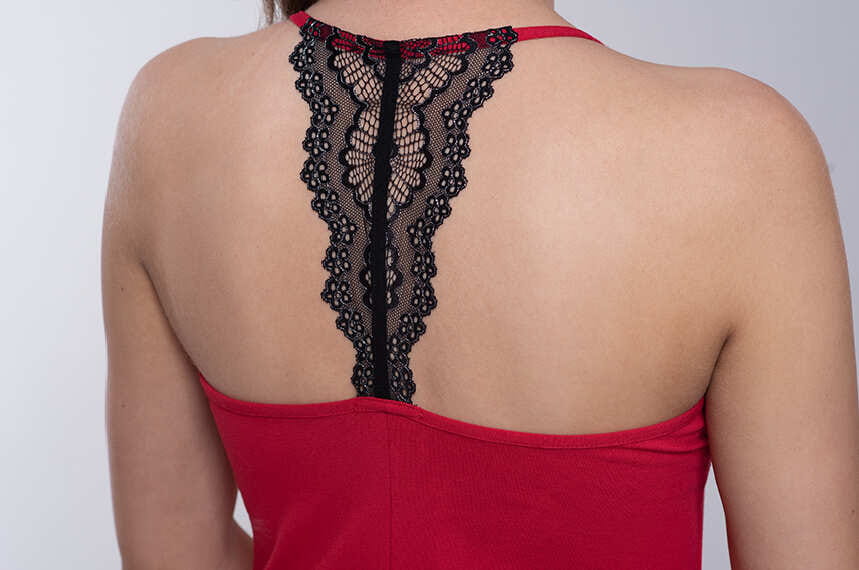 Z czarną, koronkową wstawką przy dekolcie i na plecach. Szykowna, kobieca i zmysłowa. Wykonana z połączenia naturalnej, delikatnej i lekkiej dzianiny wiskozowej, tzw. wiskozy modal, najwyższej jakości miękkiej bawełny oraz niewielkiej ilości nadającego dzianinie sprężystości elastanu.